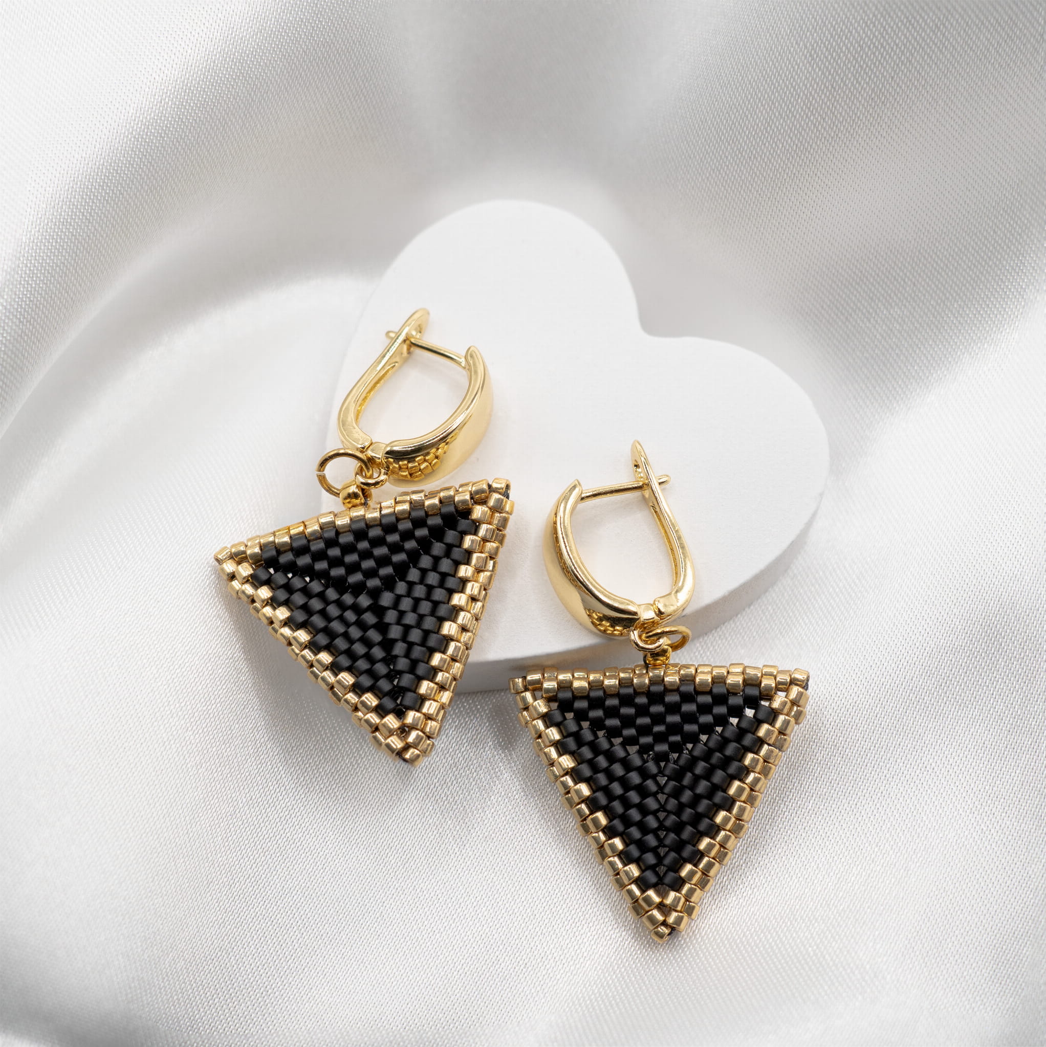 Blask Głębi to wyraziste wiszące kolczyki handmade, które łączą głęboki odcień czerni z ciepłym złotem. Wykonane z matowych koralików Miyuki, w formie odwróconego trójkąta, tworzą geometryczną kompozycję, która przyciąga wzrok i dodaje pewności siebie.