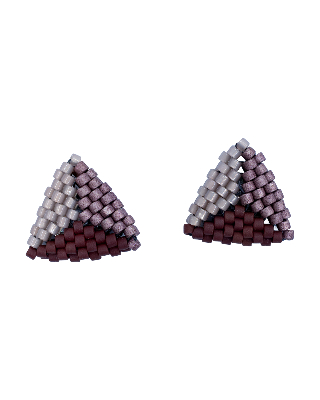 Kolczyki w kształcie trójkątów wykonane ręcznie z koralików Miyuki w odcieniach brązu, szarości i fioletu. Minimalistyczne, lekkie i eleganckie – idealne na co dzień i wyjątkowe okazje.