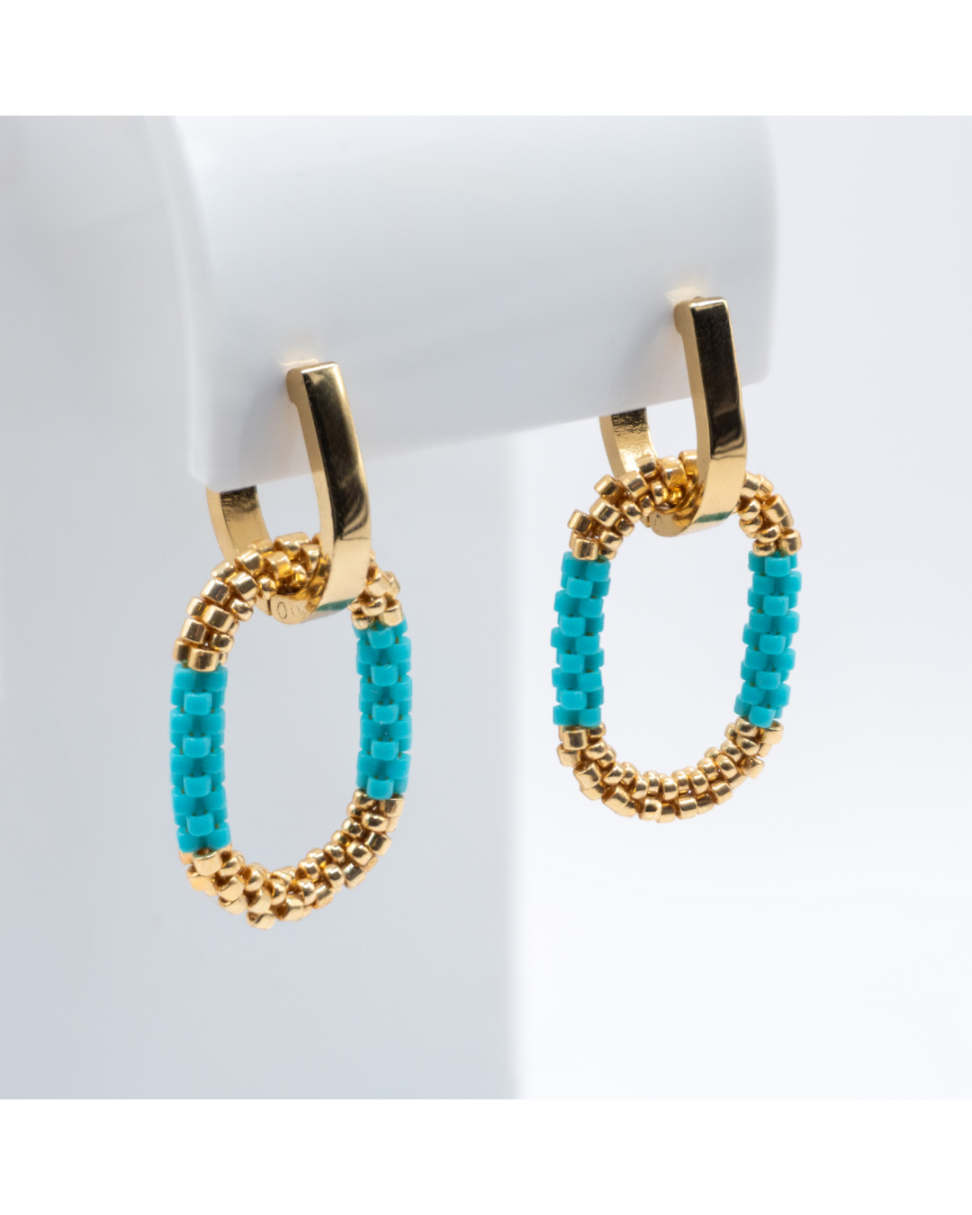 Ręcznie wykonane wiszące kolczyki z drobnych japońskich koralików Miyuki w żywym niebieskim i złotym odcieniu. Ich smukły, owalny kształt to hołd dla minimalizmu w nowoczesnym wydaniu, który harmonijnie podkreśla linię twarzy.