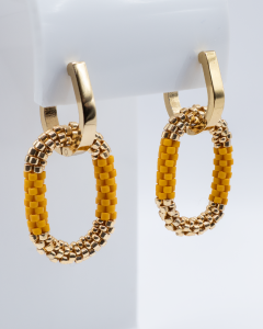 Ręcznie wykonane wiszące kolczyki z drobnych japońskich koralików Miyuki w żywym żółtym i złotym odcieniu. Ich smukły, owalny kształt to hołd dla minimalizmu w nowoczesnym wydaniu, który harmonijnie podkreśla linię twarzy.
