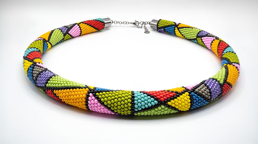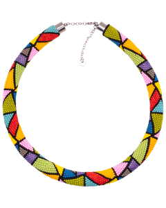 Mira to ręcznie wykonany naszyjnik etno, stworzony z precyzyjnie ułożonych, czeskich szklanych koralików Preciosa. Geometryczny, mozaikowy wzór w intensywnych kolorach przyciąga spojrzenia i dodaje stylizacjom artystycznego, etnicznego charakteru.