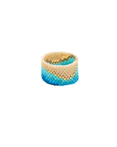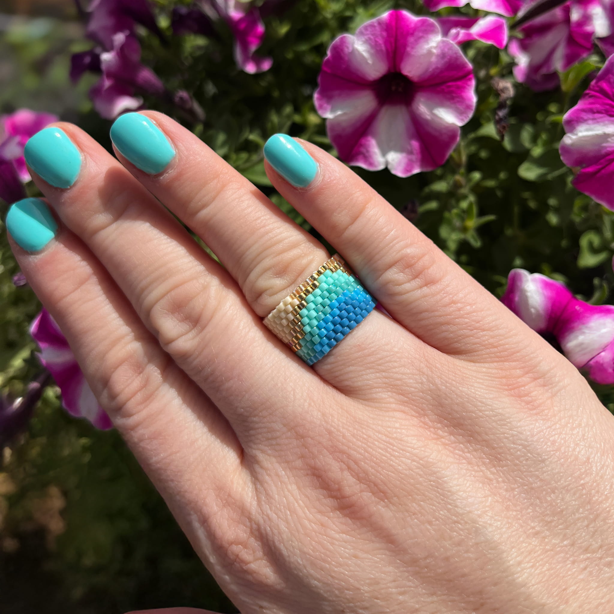 Pierścionek tkany z koralików Miyuki w odcieniach błękitu, turkusu, beżu i złota. Letnia świeżość i elegancja w jednym.