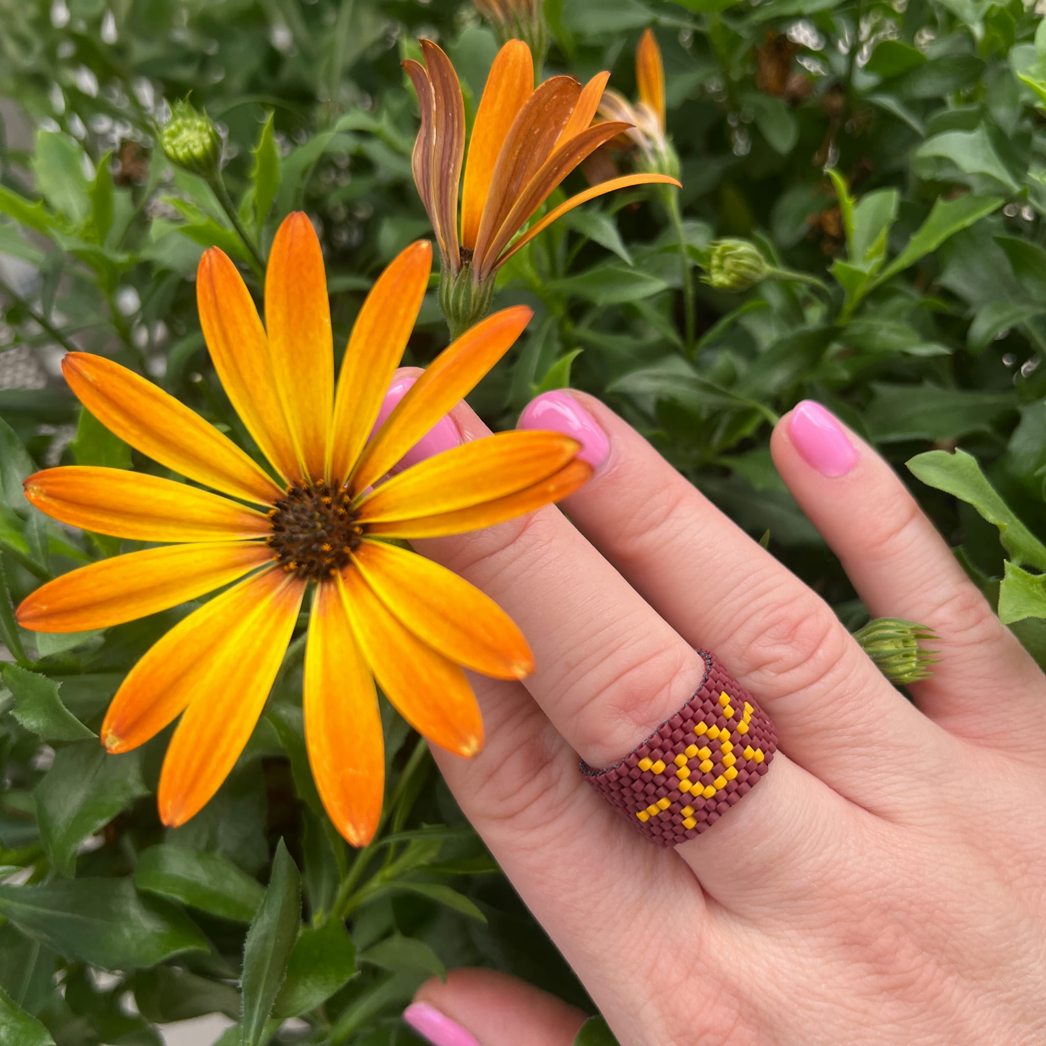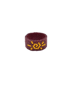 „Słoneczny Totem” to pierścionek z duszą. Ręcznie utkany z japońskich koralików Miyuki w intensywnych kolorach brązu i głębokiej żółci, tworzy geometryczny, niemal rytualny wzór przypominający słońce.